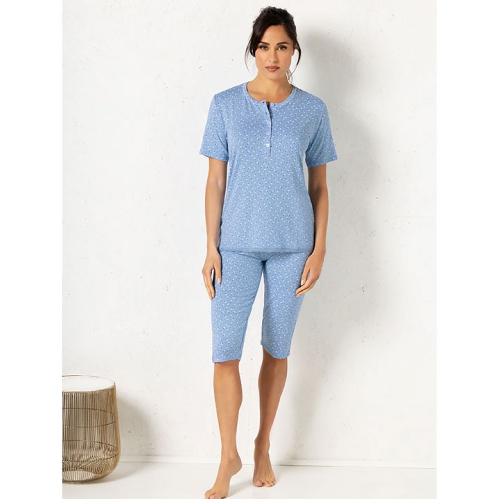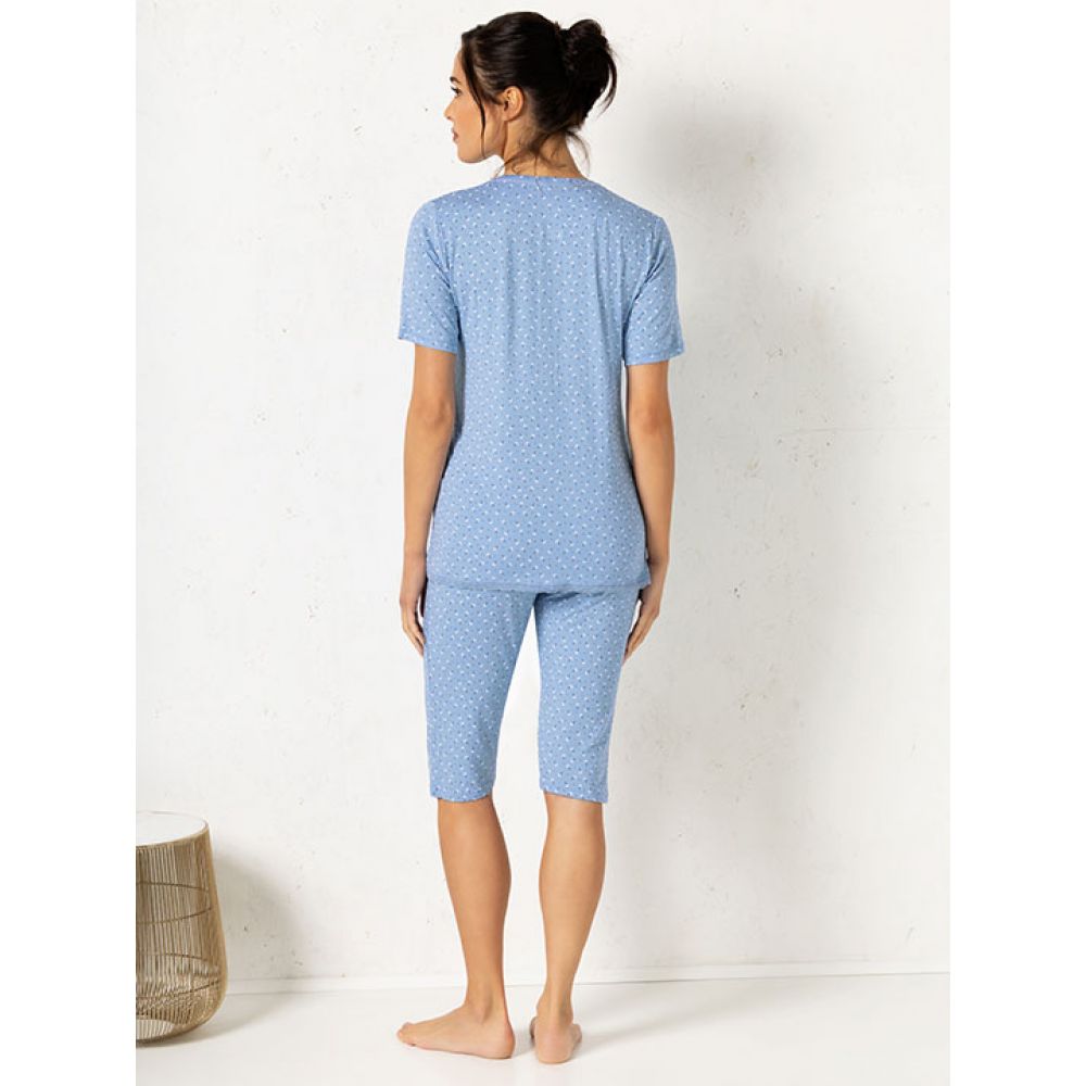 Комплект: футболка с коротким рукавом и шорты. Застежка на пуговицы. Выполнен из вискозы с кружевной отделкой.