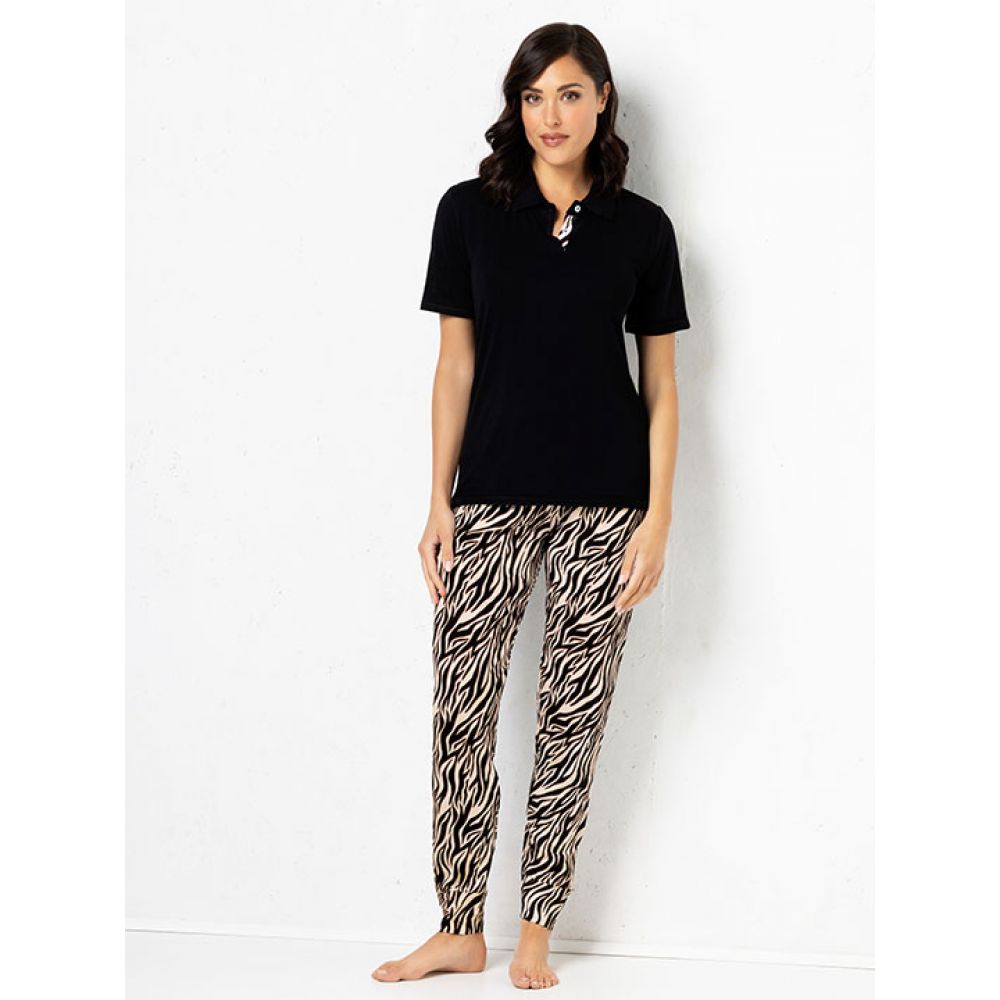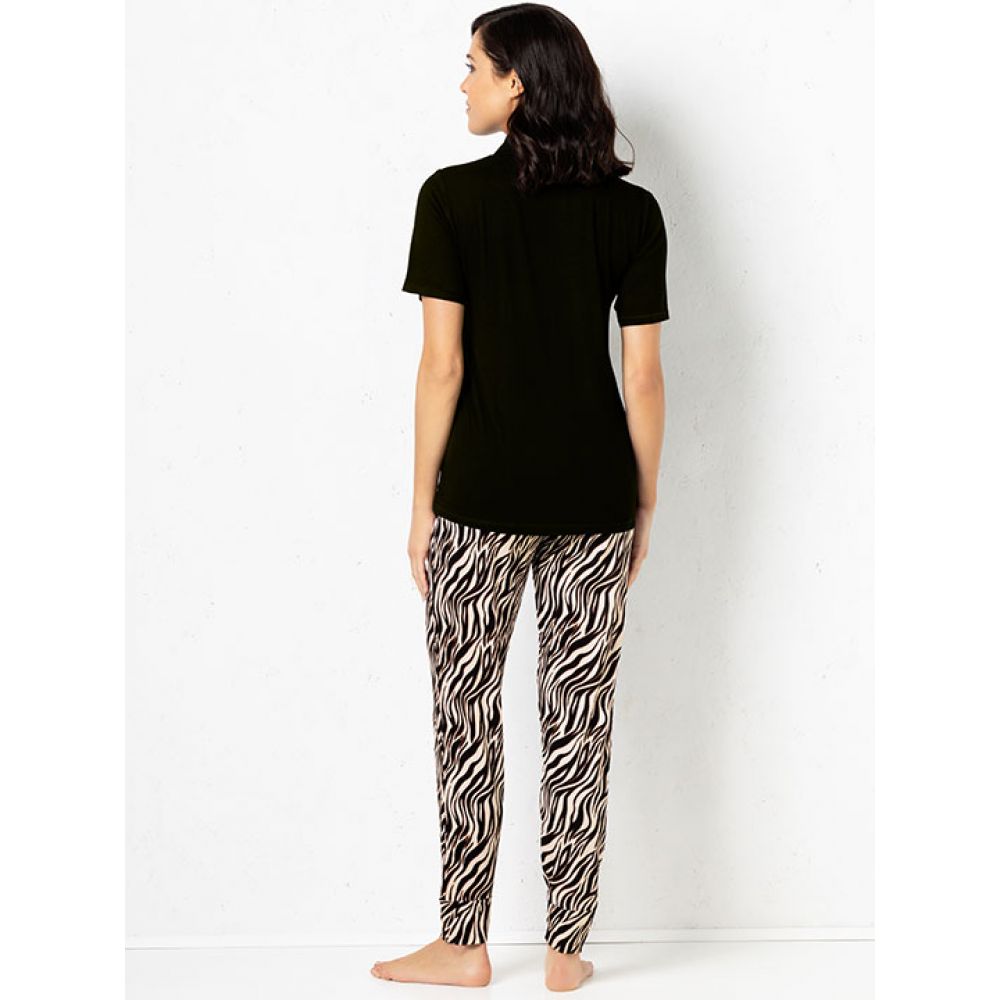 Комплект: футболка с коротким рукавом и зауженные брюки с манжетами. Застежка на пуговицы. Выполнен из вискозы.