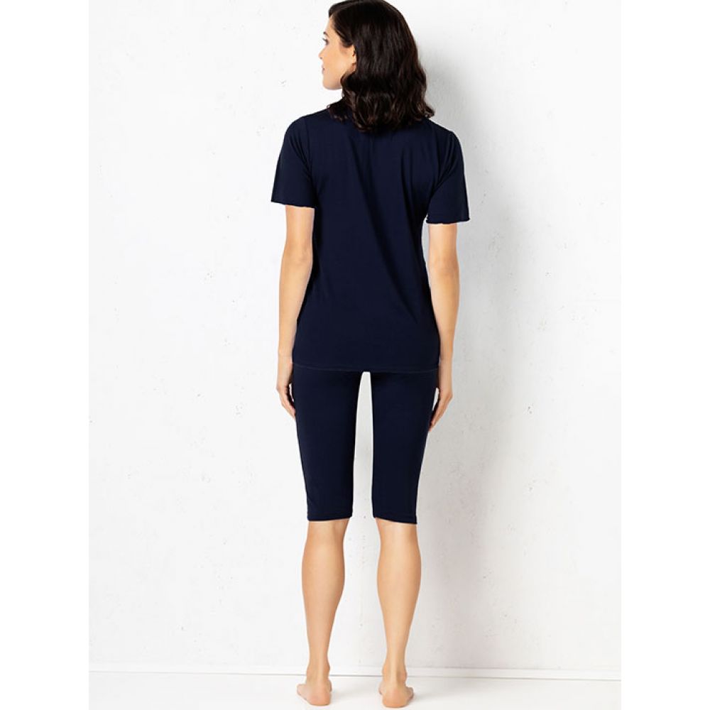 Комплект: футболка с коротким рукавом и капри. Выполнен из вискозы с кружевной отделкой.