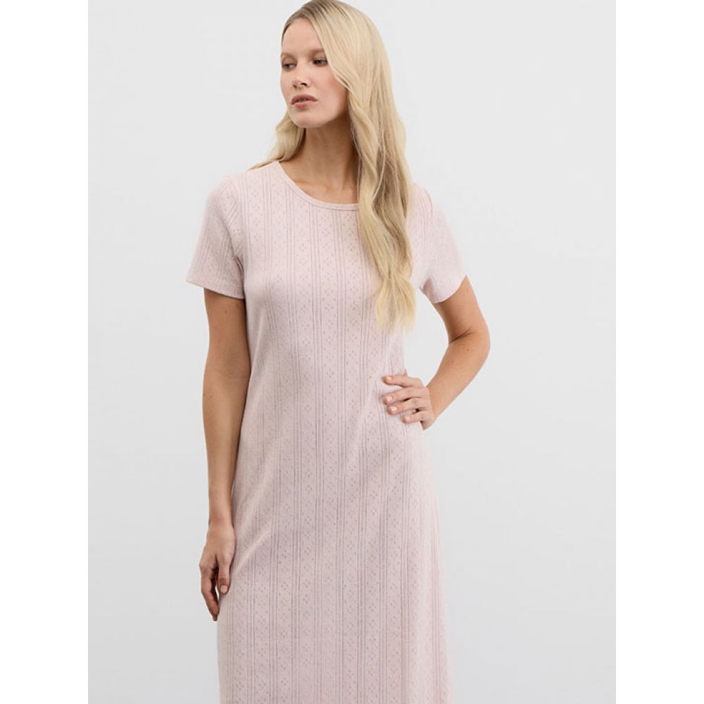 Сорочка средней длины с круглым вырезом и коротким рукавом. Материал - хлопок рибана с фигурной перфорацией.