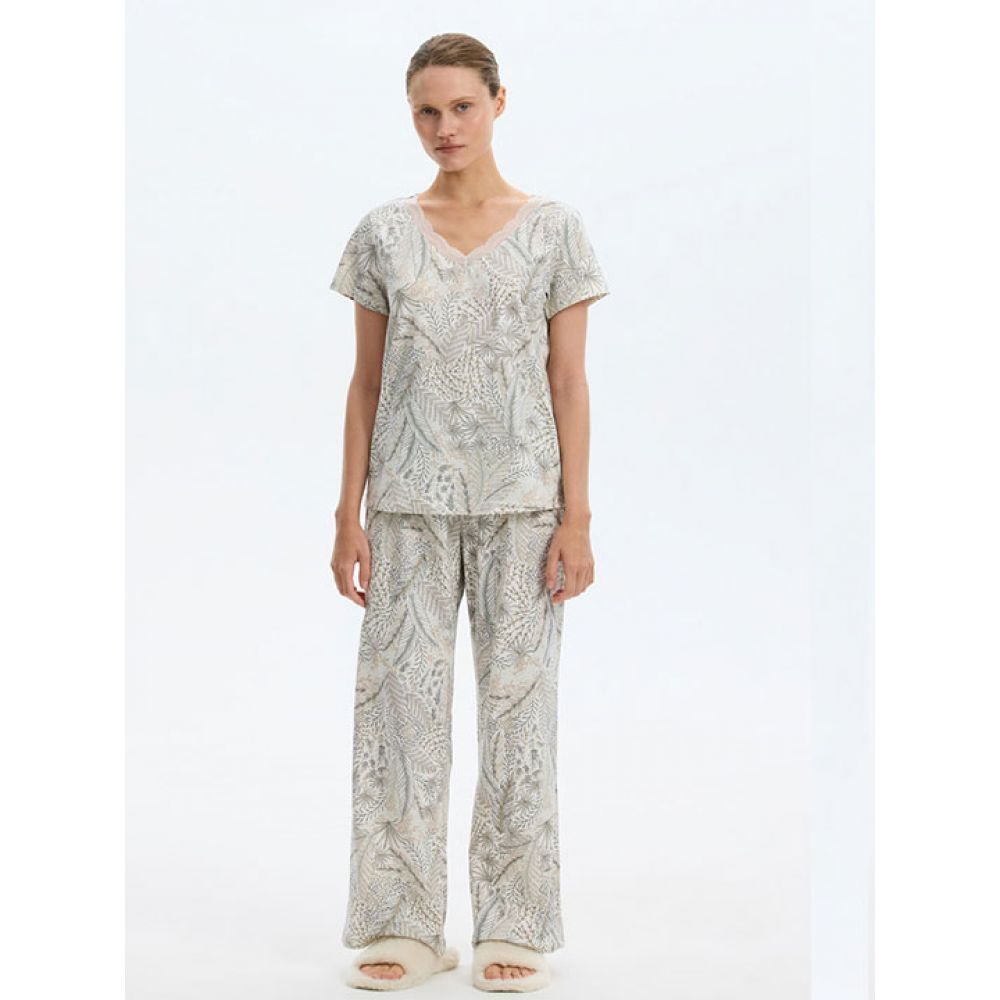 Пижама из футболки с коротким рукавом и брюк свободного прямого кроя. Футболка с V-образным вырезом, декорированным кружевом. Брюки на резинке. Выполнена из набивного трикотажа супрем с нежным рисунком.