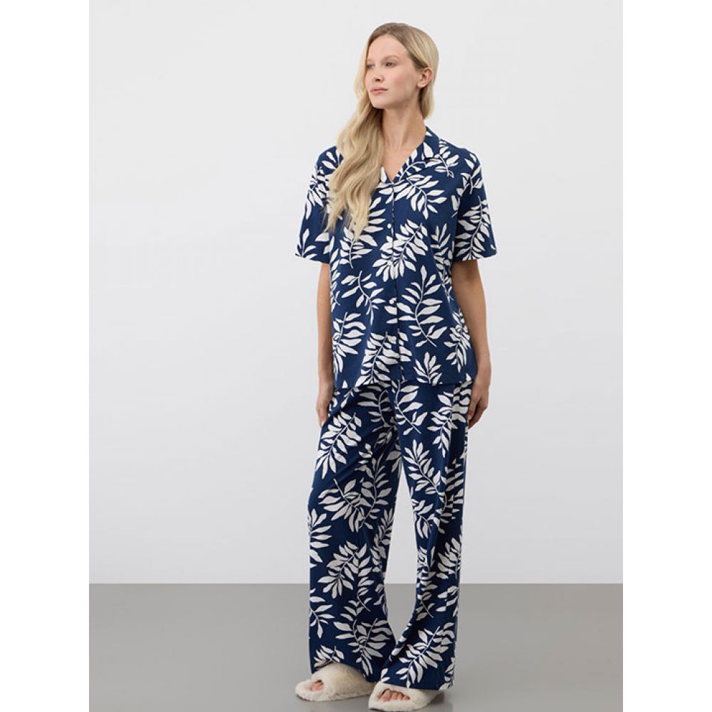 Пижама из рубашки с коротким рукавом и прямых брюк. Рубашка с отложным воротником и застежкой на пуговицы. Выполнена из набивного трикотажа супрем с нежным рисунком.