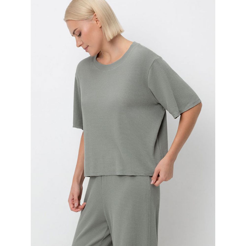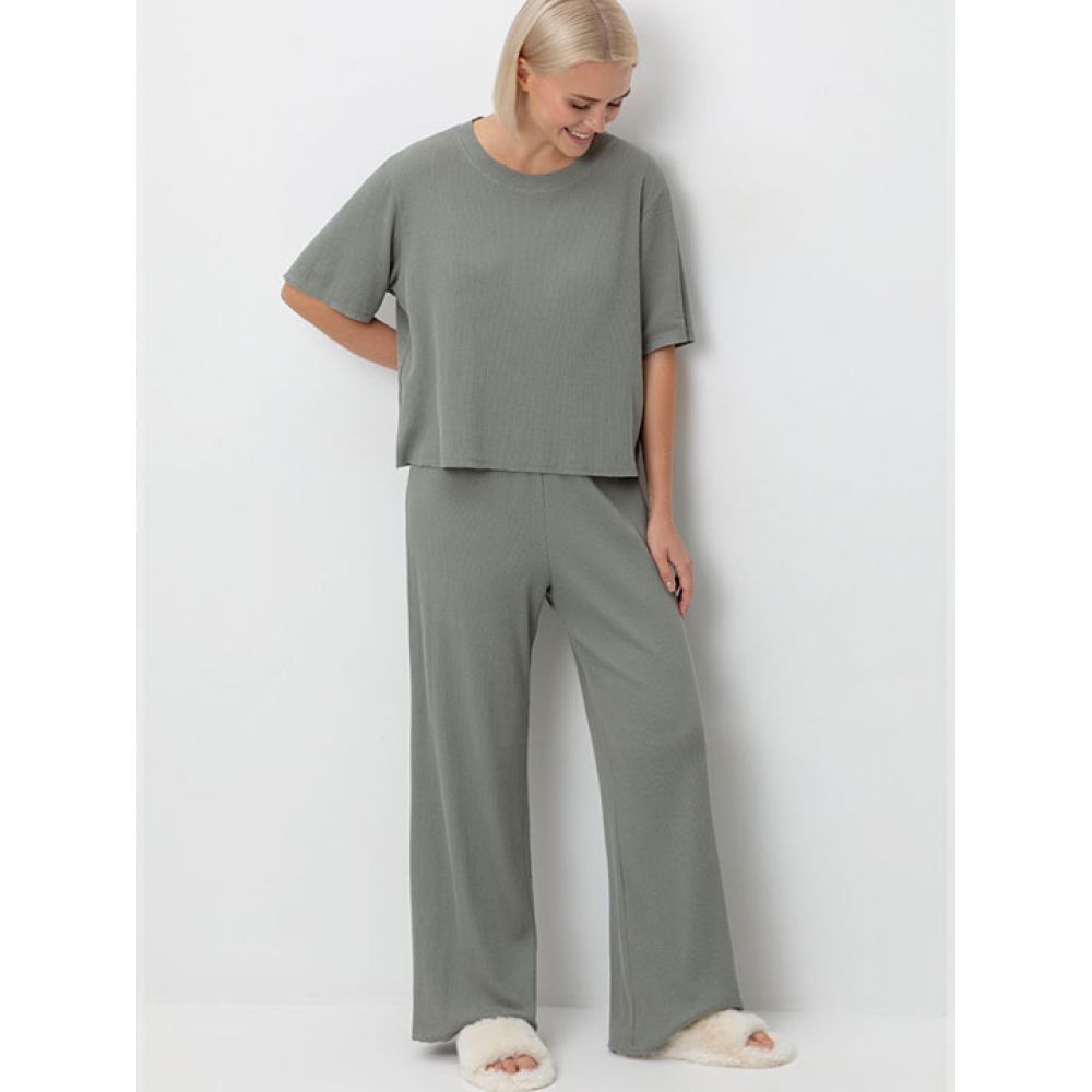 Комплект для комфортного сна из трикотажного полотна. В составе 100% натуральный хлопок. Футболка с коротким спущенным рукавом. Брюки с мягким поясом на резинке удобно садятся по фигуре.
