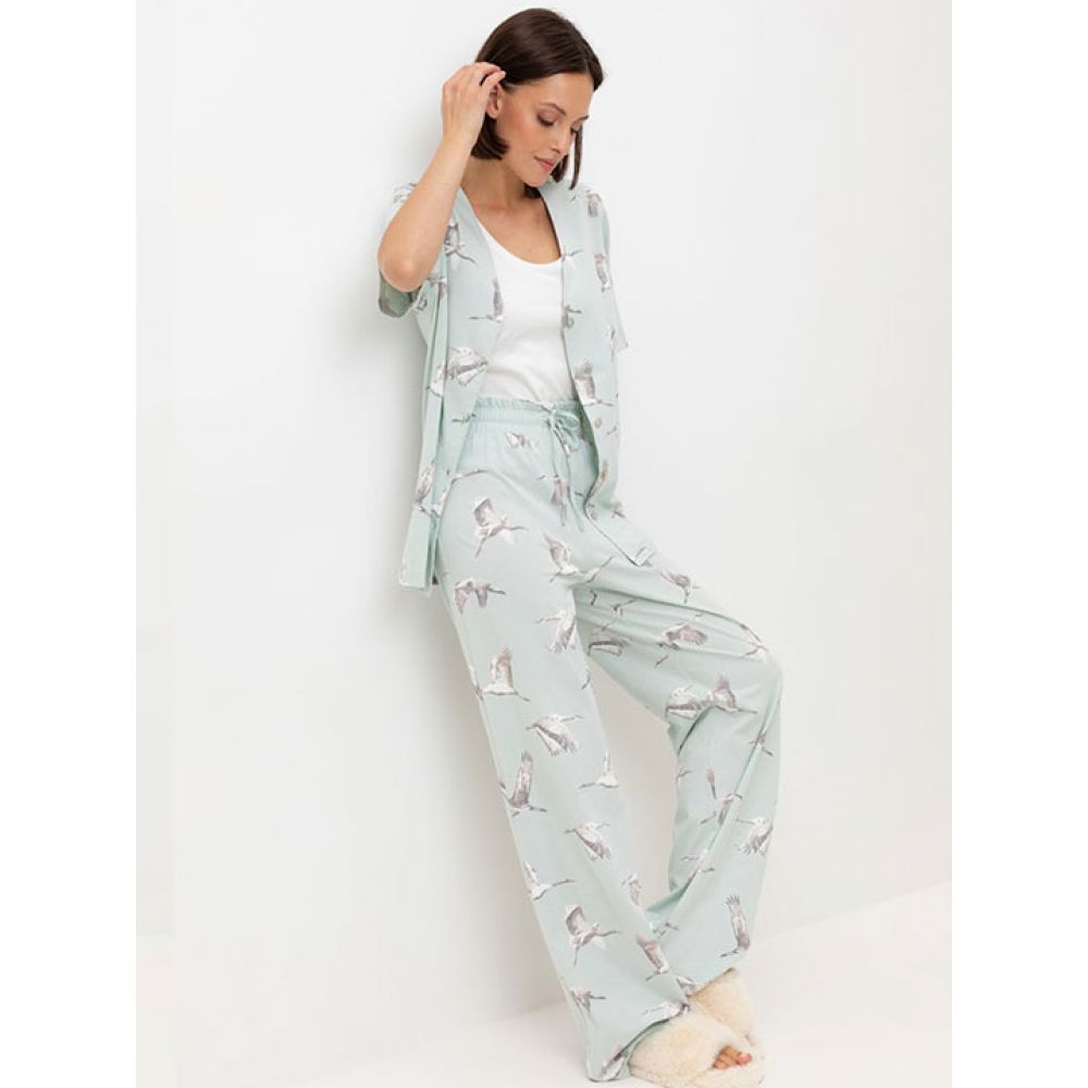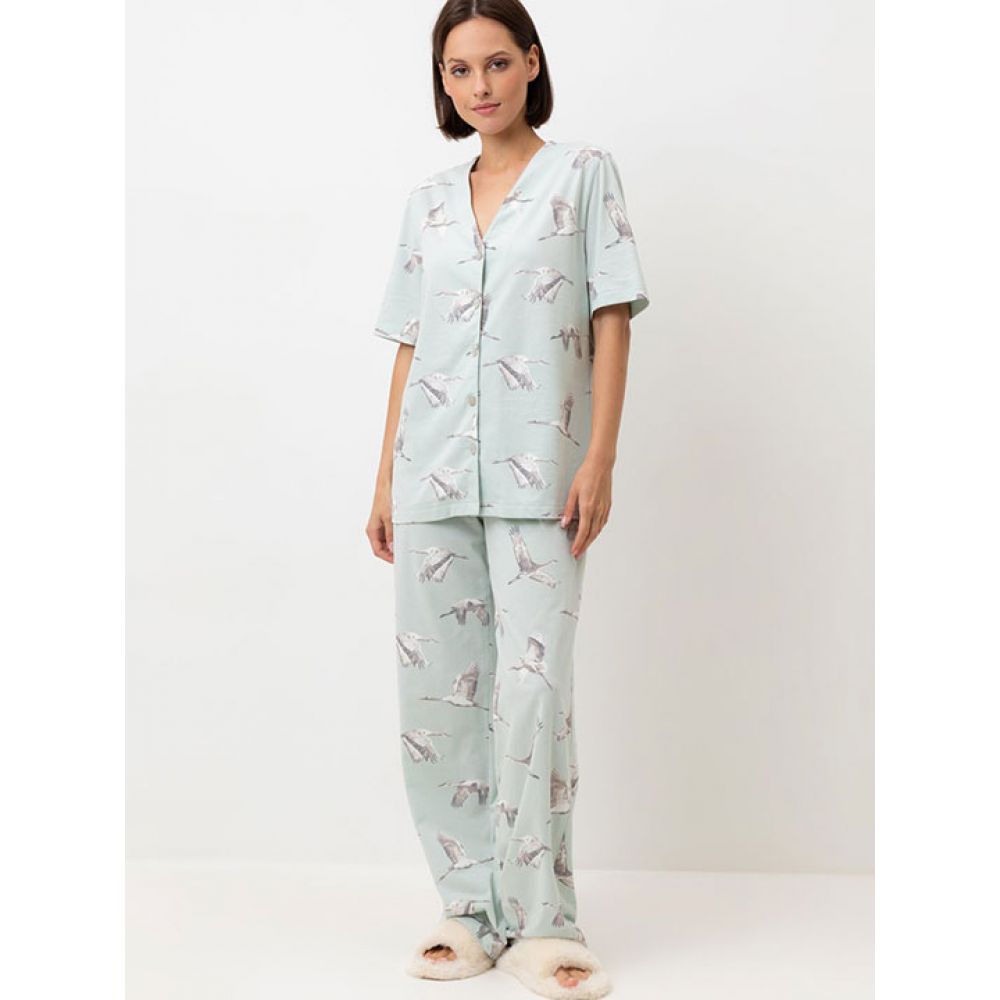 Комплект для комфортного сна и отдыха из набивного трикотажа из 100% натурального хлопка. Рубашка с короткими рукавами на пуговицах. Брюки с мягким поясом на резинке. Гладкий материал приятен к телу, не теряет форму и позволяет коже дышать.