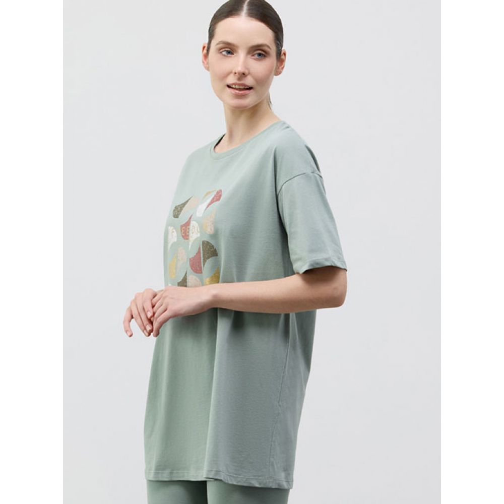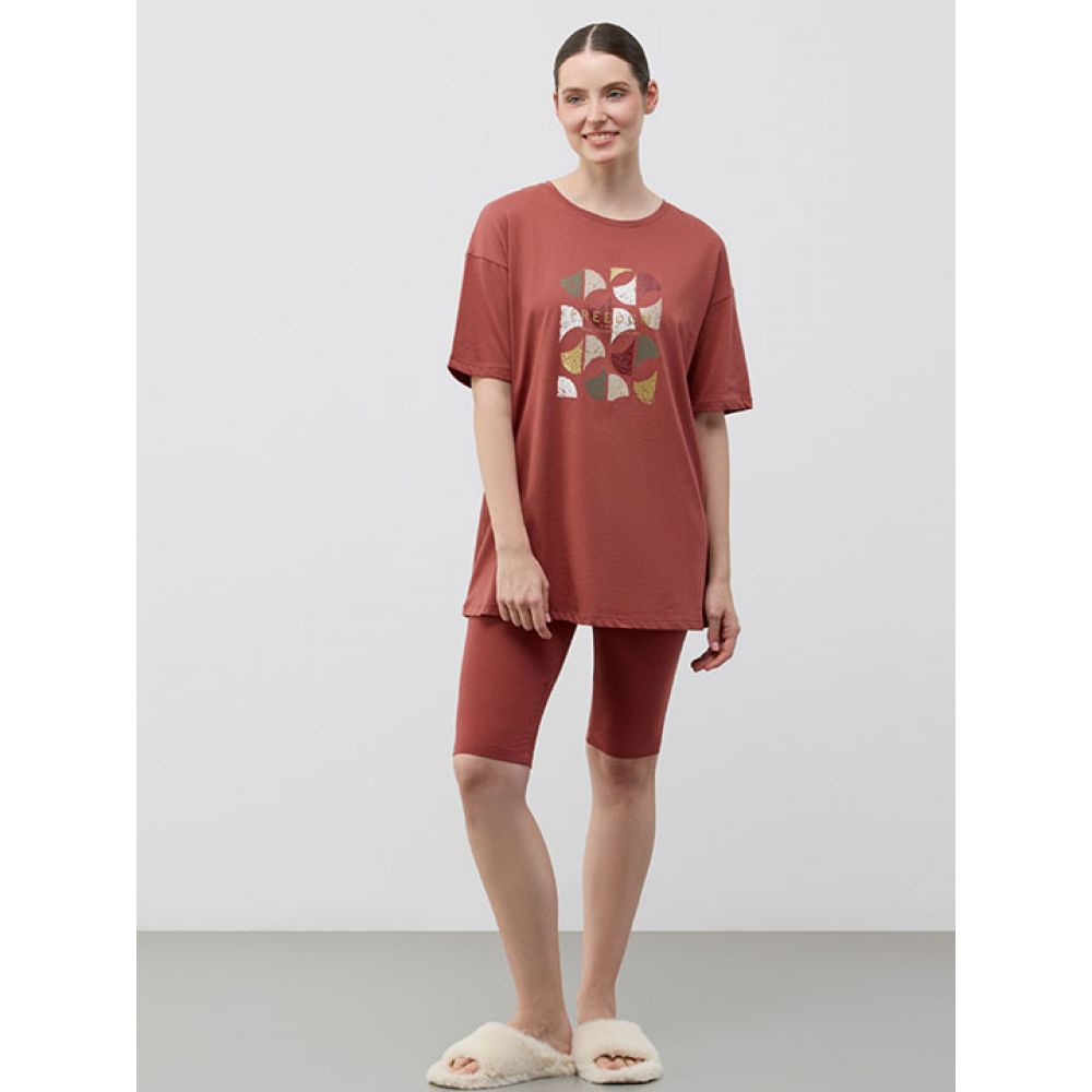 Пижама из футболки с коротким рукавом и бриджей. Составной материал: футболка из из набивного трикотажа супрем , бриджи из эластичного трикотажа со спандексом для лучшего прилегания.