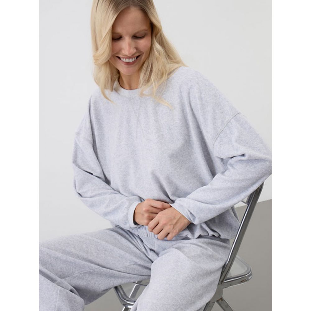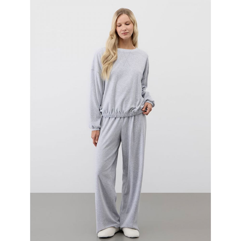 Пижама из джемпера с длинным рукавом и свободных брюк. Выполнена из нежного велюра.