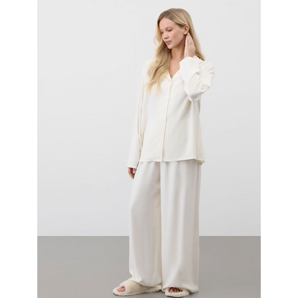 Пижама из рубашки с длинным рукавом и свободных брюк. Рубашка с отложным воротником. Материал - текстильная ткань из вискозы, что придает модели более нарядный и гладкий вид.