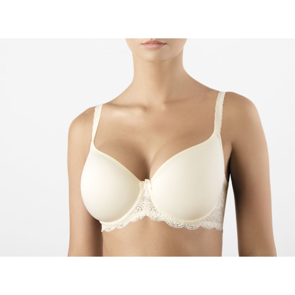 Бюстгальтер с формованными чашками на каркасах. Чашки бюстгальтера выполнены из специального дышащего не мнущегося материала. Боковая деталь стана - из кружевного полотна.